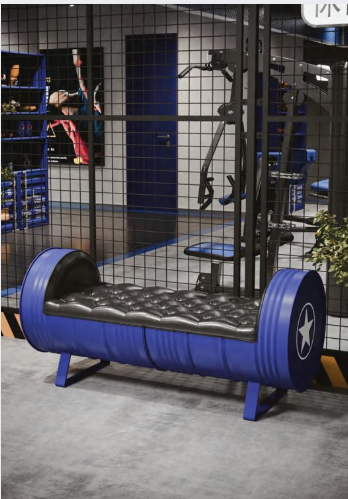 Banco fabricado a partir de un barril metálico reciclado, transformado en un asiento de diseño industrial y contemporáneo. Su acabado en azul intenso con detalles decorativos tipo insignia aporta un toque llamativo y moderno. El asiento acolchado y tapizado en cuero sintético negro, con costuras capitoné, proporciona comodidad y estilo a partes iguales. Su estructura robusta y estable lo hace ideal para zonas de espera, espacios temáticos, gimnasios o establecimientos que busquen un mobiliario funcional y con fuerte carácter decorativo.