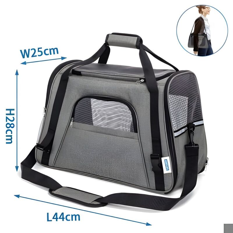 Bolsa de viaje para mascotas en color negro, con dimensiones de 44×25×28 cm, diseñada para ofrecer comodidad, seguridad y facilidad de transporte para animales pequeños. Fabricada con materiales duraderos y ligeros, proporciona estabilidad durante el traslado y resulta práctica para viajes urbanos, visitas al veterinario o desplazamientos cortos.