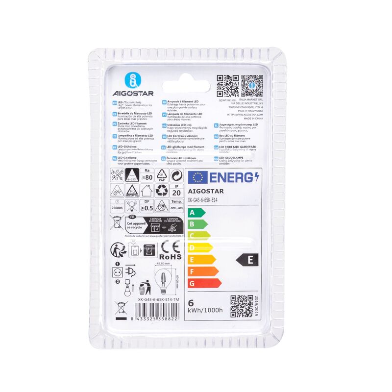 La bombilla de filamento LED G45 E14 de Aigostar es una elección ideal para quienes buscan eficiencia energética, estilo y calidad en un solo producto. Combina ahorro, durabilidad y estética, convirtiéndose en una opción confiable y versátil para cualquier entorno, adecuada para plataformas de venta online como Amazon o Miravia.