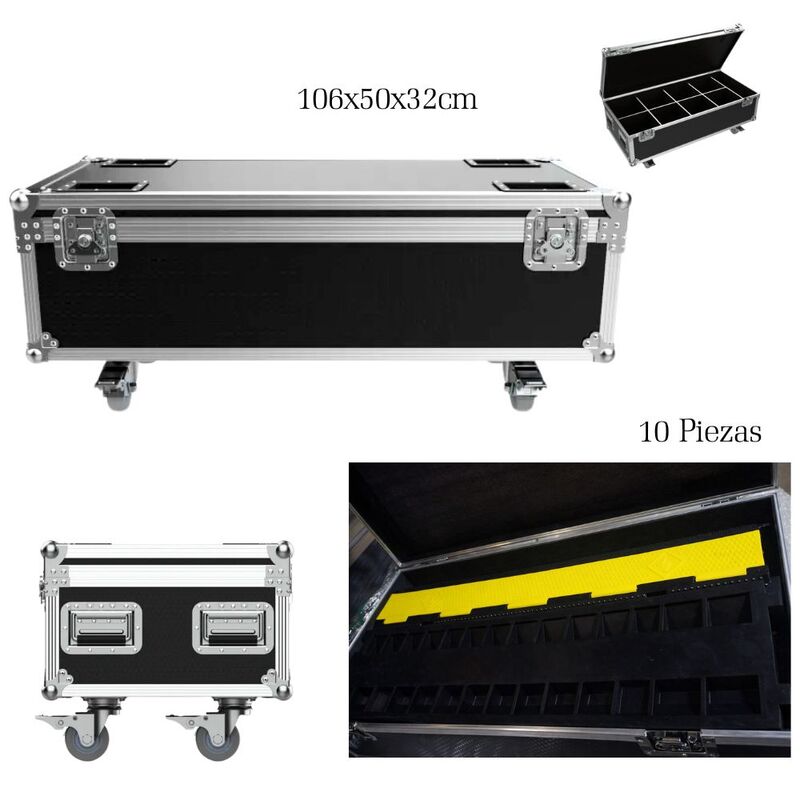 La caja de almacenamiento tipo flight case es la solución ideal para transportar y proteger pasacables de forma segura y organizada. Incluye 10 piezas de pasacables, manteniéndolas ordenadas y listas para su uso en eventos, instalaciones técnicas o entornos industriales. Fabricada con estructura reforzada y acabados resistentes, protege el contenido frente a golpes, polvo y humedad. Incorpora asas laterales y cierres metálicos que facilitan el transporte y la manipulación.