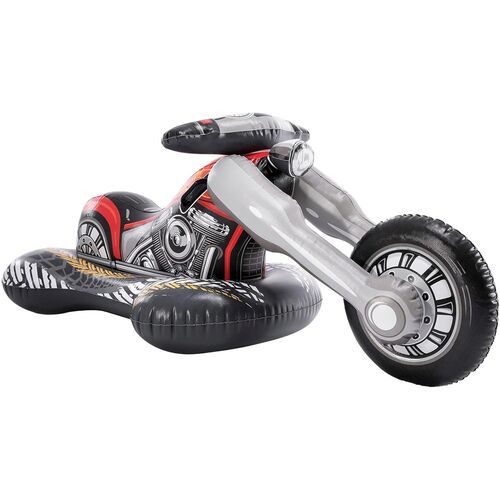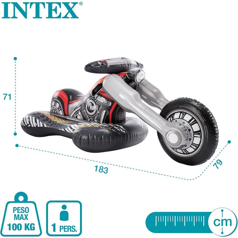 El montable inflable con diseño de motocicleta Cruiser de la marca Intex es un artículo recreativo de dimensiones generosas, diseñado para ofrecer una experiencia de flotación superior tanto en piscinas como en entornos de playa. Con unas medidas de 183 centímetros de longitud, 79 centímetros de anchura y 71 centímetros de altura, este inflable destaca por su imponente presencia visual, que recrea con gran detalle la estética de una motocicleta de estilo clásico, incluyendo elementos como el motor expuesto, el faro delantero y neumáticos de perfil ancho.