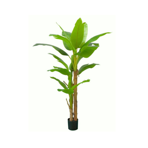 Su tronco está fabricado en resina con refuerzo metálico, ofreciendo resistencia y estabilidad, mientras que sus hojas están confeccionadas en poliéster y plástico PE, resistentes al paso del tiempo y fáciles de limpiar. La planta viene montada en una maceta de plástico negro, lo que facilita su colocación inmediata, aunque también puede introducirse en una maceta decorativa a elección para realzar aún más su presencia.