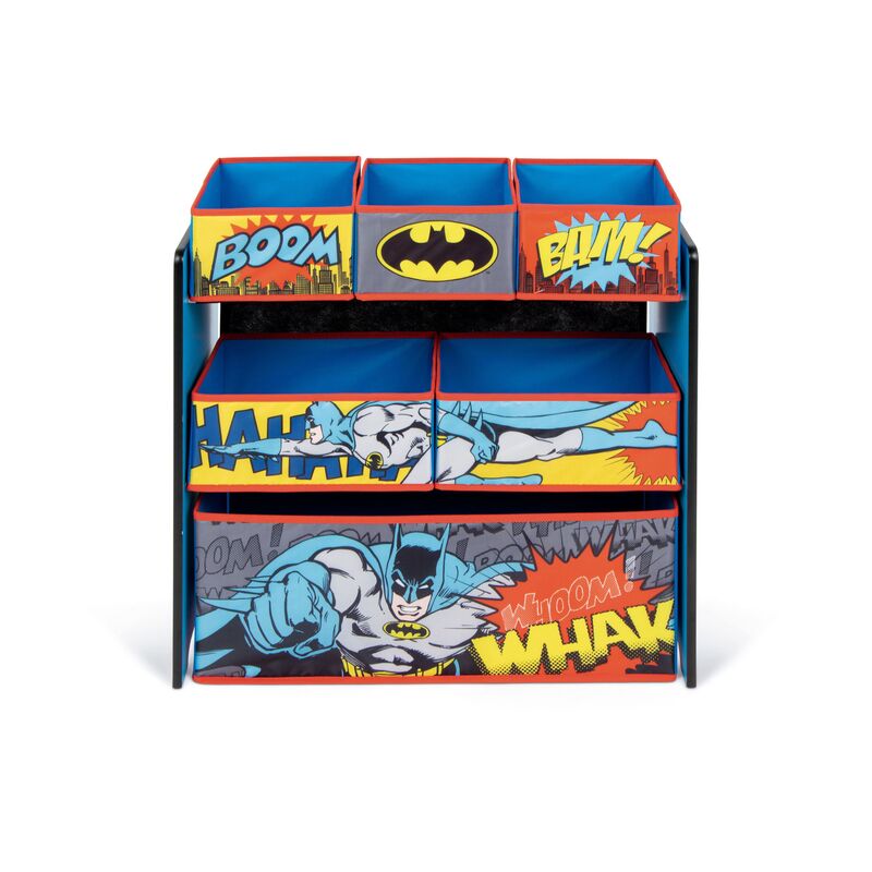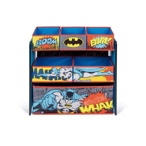 Fabricado con una resistente estructura de madera, este mueble garantiza durabilidad y estabilidad, mientras que los cestos de tela añaden un toque práctico y ligero, facilitando su manejo por los niños. Su diseño con los característicos colores negro y amarillo de Batman, junto con su icónico logotipo, hacen que este organizador se convierta en el complemento perfecto para habitaciones infantiles o salas de juegos temáticas.