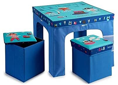 • Set compuesto por una mesa plegable y 2 taburetes plegables de color azul, diseño pirata para dormitorio infantil.