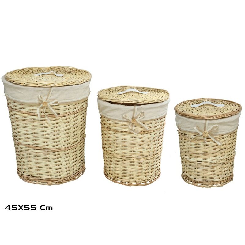 Las del pongotodo principal son de 45 x 55 cm, lo que garantiza una gran capacidad para almacenar ropa sucia, ropa de cama o accesorios de mayor volumen. El conjunto incluye tres cestos en diferentes tamaños, ofreciendo soluciones versátiles para distintas necesidades de organización. Además, su diseño con tapa permite mantener la discreción del contenido, mientras que el detalle decorativo del lazo y el botón en la parte frontal aporta un toque elegante y artesanal que combina con estilos clásicos, rústicos o modernos.