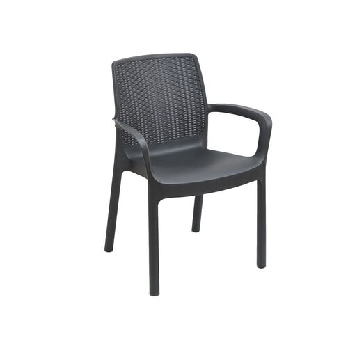 El color antracita aporta un toque sobrio y sofisticado que se adapta fácilmente a diferentes estilos de decoración. Su diseño ergonómico con respaldo envolvente y reposabrazos integrados proporciona un asiento cómodo y estable, ideal para disfrutar de largos momentos de relax, reuniones al aire libre o comidas con amigos y familia. Además, al ser apilable, facilita el almacenamiento y el ahorro de espacio, siendo perfecto para hogares con espacio limitado o para quienes buscan soluciones versátiles y prácticas.